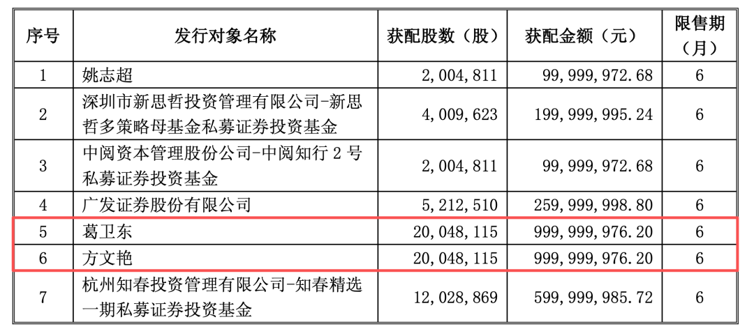 其中,私募大佬葛卫东斥资约10亿元认购2004.81万股。方文艳出资10亿元认购2004.81万股股份。媒体公开信息显示,方文艳是超级牛散章建平的妻子。