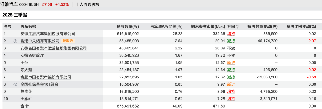 此外,江淮汽车2025年中报显示,葛卫东关联人葛贵莲现身其前十大股东名单,截至2025年三季报,葛贵莲持有股份数量增至1661.62万股,持仓市值为8.96亿元。
