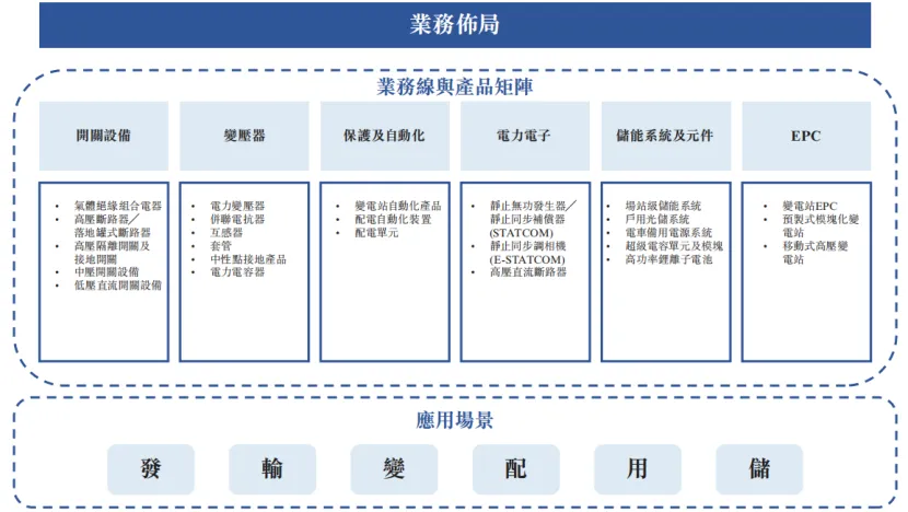 公司构建了覆盖开关类、变压器类、保护及自动化类、电力电子类、储能(核心股)系统及元件类、EPC类等六大核心业务线的产业链布局。