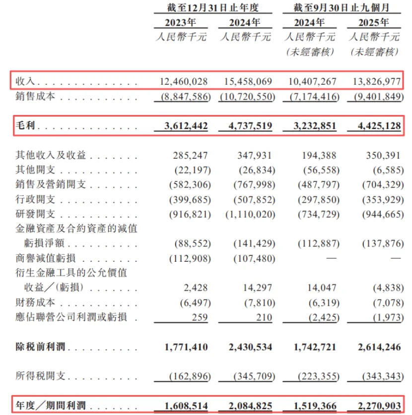 2023年、2024年及2025年1-9月(报告期),公司的收入分别为124.6亿元、154.58亿元、138.27亿元,净利润分别为16.09亿元、20.85亿元、22.71亿元,毛利率分别为29%、30.6%、32%。