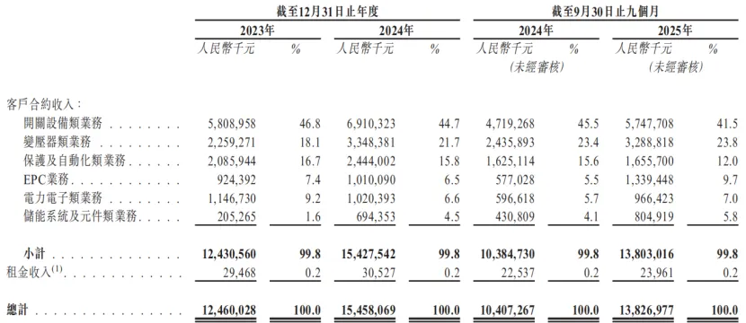按业务类别划分,开关设备类业务是思源电气的主要收入来源,2025年前三季度的收入占比为41.5%,较2023年有所下降。