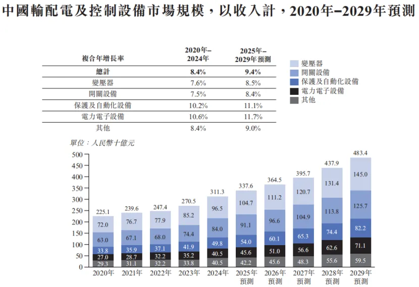 根据弗若斯特沙利文的资料,全球输配电及控制设备市场规模由2020年5808亿元增长至2024年8636亿元,复合年增长率为10.4%;预计2029年达到14755亿元,2025年至2029年的复合年增长率为11.3%。