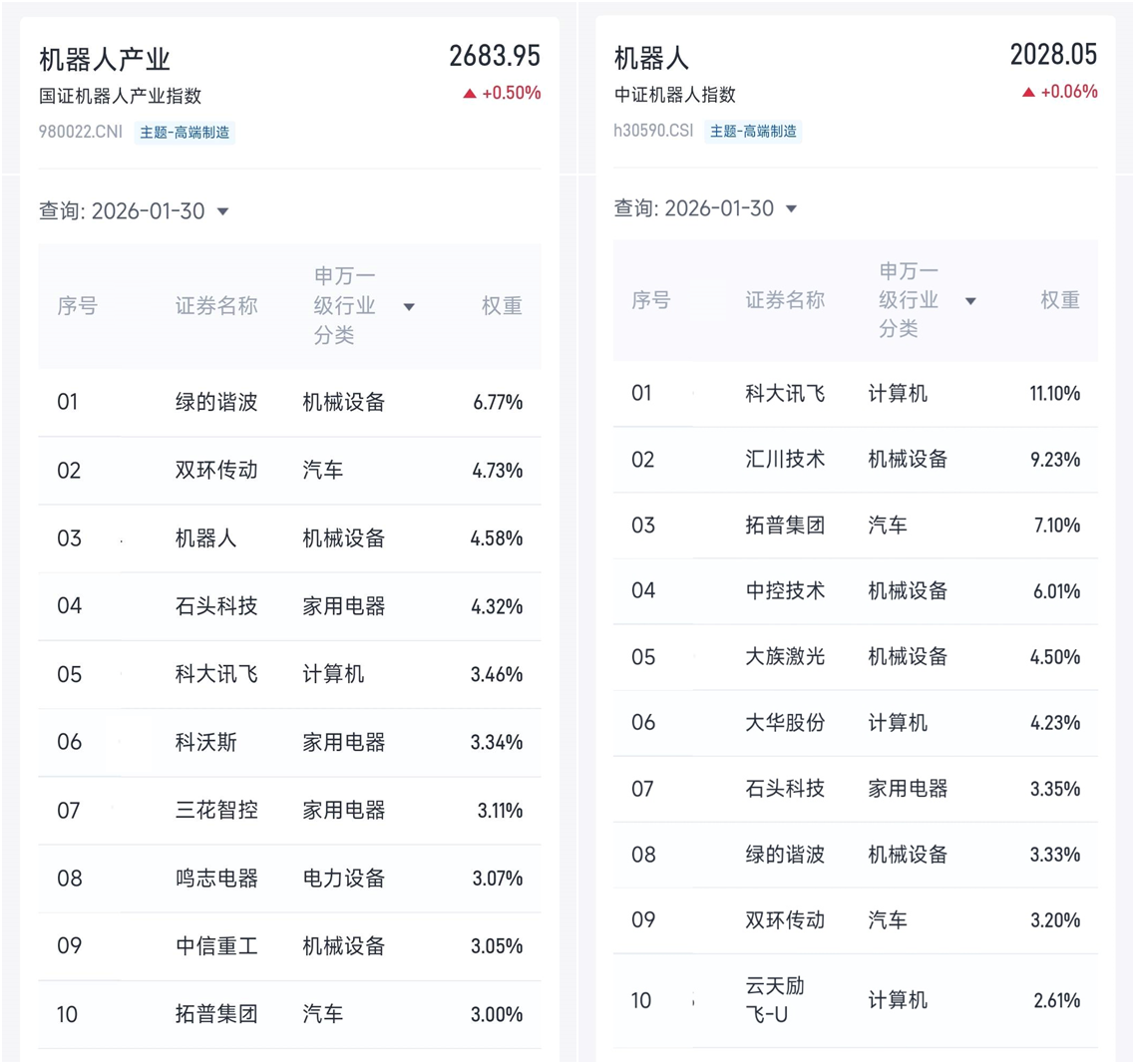 从成份股来看,国证机器人产业指数目前成份股数量为50只,前十大成份股合计权重约40%,其中单只个股权重多在3%-5%之间,占比相对均衡;中证机器人指数目前成份股数量为66只,前十大成份股合计权重约55%,前两大权重股占比超20%,集中度更高。两只指数的前十大成份股均包括绿的谐波、科大讯飞、拓普集团、石头科技、双环传动等企业,而国证机器人产业指数特有三花智控等人形机器人零部件产业链企业,中证机器人指数则特有大族激光、大华股份等企业。