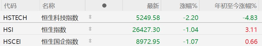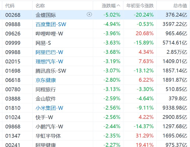 正文 跌幅扩大!恒生科技指数跌超2%,恒指跌超1% 三木 V管理员 /02-20 /0 评论 /7 阅读 0220 文章最后更新时间2026年02月20日,若文章内容或图片失效,请留言反馈! 2月20日,港股跌幅进一步扩大,恒生科技指数跌2.2%,恒指、国企指数跌超1%。恒生科技指数成分股中,金蝶国际跌5%,百度集团跌近5%,哔哩哔哩、网易、阿里巴巴、理想汽车、腾讯音乐、同程旅行跌超3%。 股票频道更多独家策划、专家专栏,免费查阅>>