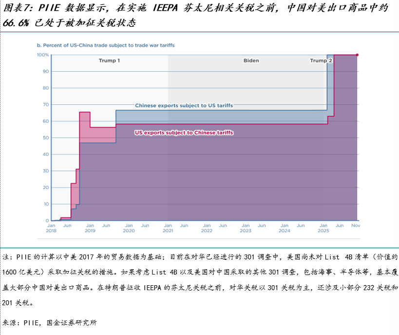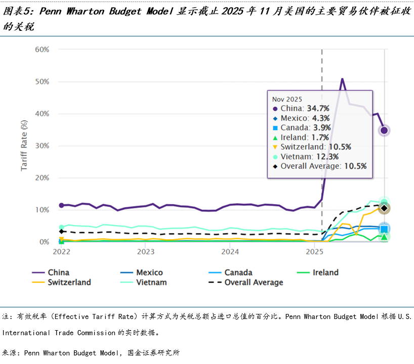 答:根据Penn Wharton Budget Model的测算,截至2025年11月,美国对华有效关税率约为34.7%,其中包括约10%的301关税、10%的对等关税、10%的芬太尼关税,以及232行业关税和最惠国(MFN)关税等。