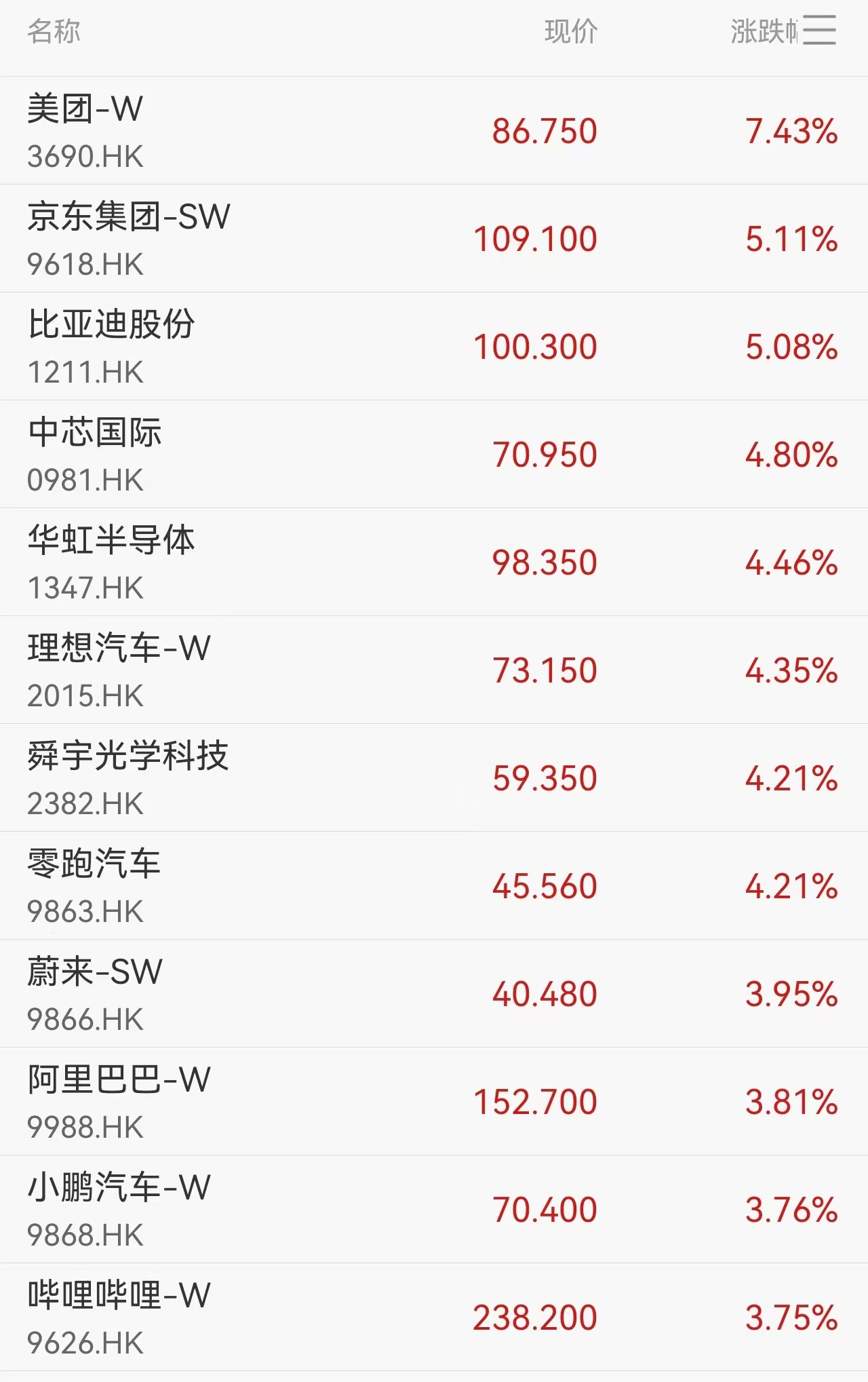 盘面热点全面扩散,科技股成为领涨主力。美团涨超7%,京东集团、比亚迪股份涨超5%,中芯国际涨近5%,华虹半导体、理想汽车、舜宇光学科技、零跑汽车涨超4%,阿里巴巴、快手、小米集团、百度集团、商汤、网易、哔哩哔哩等均涨超3%。