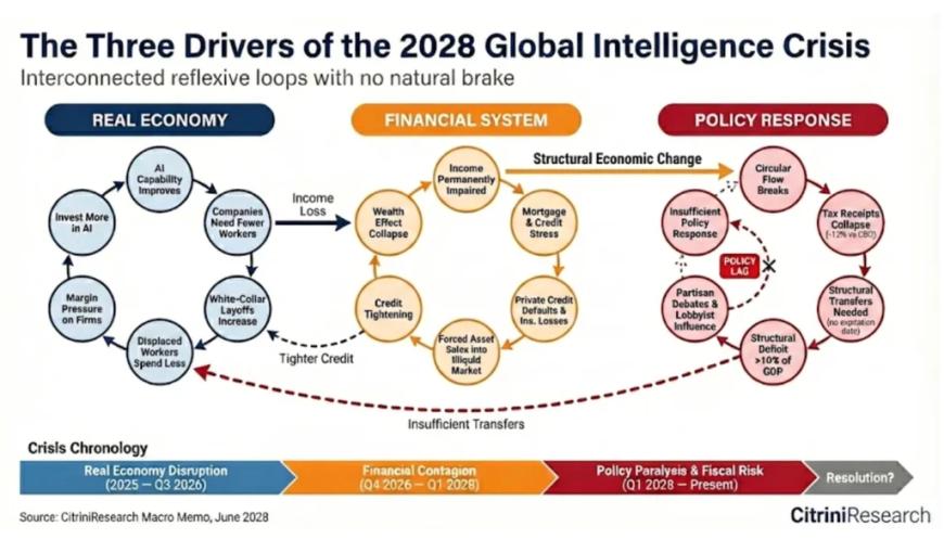 Citrini Research在一份题为《2028全球智能危机》(The 2028 Global Intelligence Crisis)的宏观情景研究中,给出了一个极具挑衅性的“反直觉”推演:如果人工智能(AI)革命推进得太快、太彻底,AI的成功本身反而可能成为经济与金融不稳定的主要引擎。该报告由Alap Shah等共同撰写,核心假设是到2028年全球经济可能陷入“智能替代螺旋”(intelligence displacement spiral)——机器智能极度充裕,迅速替代复杂白领劳动,引发需求坍塌、结构性通缩与资产价格重估。
