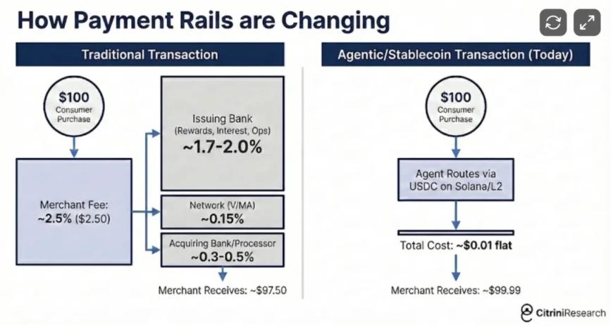 报告进一步把冲击推向金融体系“管道层”。它认为,支撑银行奖励体系与发卡业务的2%—3%信用卡交换费可能被AI代理绕开:在机器对机器交易中,稳定币在Solana或以太坊二层网络上可以实现近乎实时、几乎“零成本”的小额结算,从而使传统卡组织的结算轨道显得昂贵且低效。