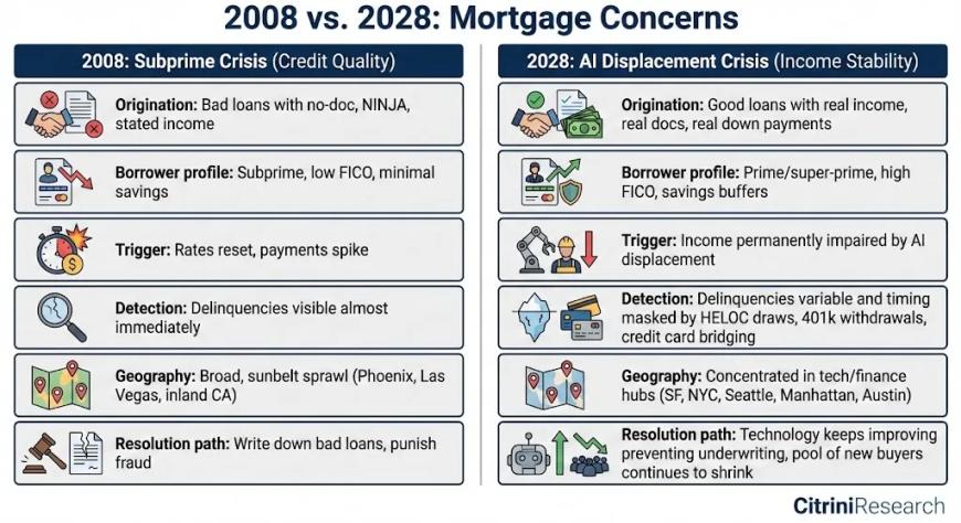报告最“刺耳”的部分在于对美国住宅按揭市场(约13万亿美元)的担忧。它认为,与2008年“坏在起点”的次贷不同,2028情景的风险是“起点很好,但世界变了”。传统按揭承销隐含假设是:FICO 780的借款人能在30年里维持收入水平。