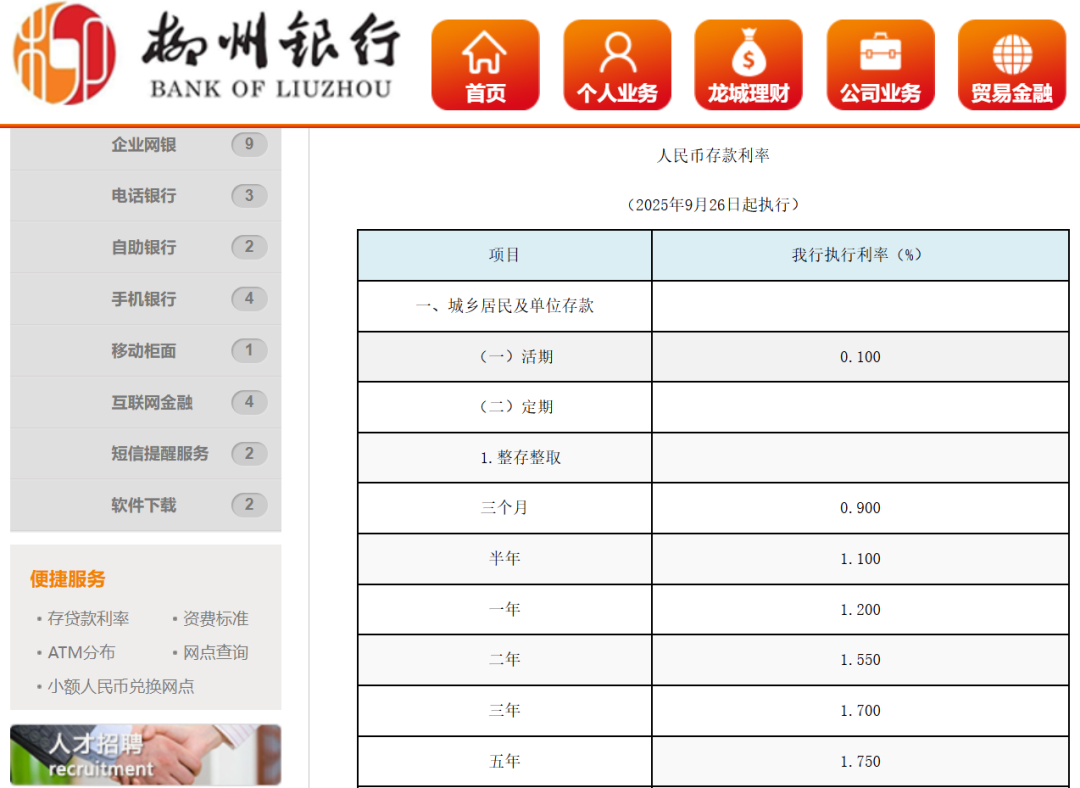 比如,工商银行一年期的挂牌利率0.95%,而柳州银行的挂牌利率则为1.20%。