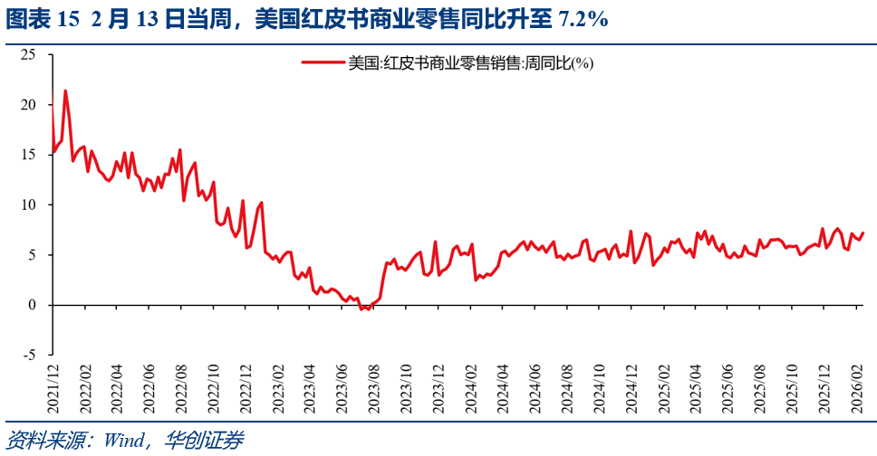 美国零售销售回升。2月13日当周,美国红皮书商业零售销售同比7.2%,2月6日当周为6.5%。