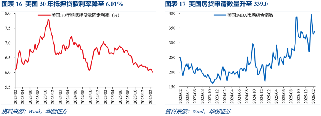 抵押贷款申请数量回升。2月13日当周,美国MBA市场综合指数(反映抵押贷款申请数量情况)升至339.0,环比一周前回升2.8%。