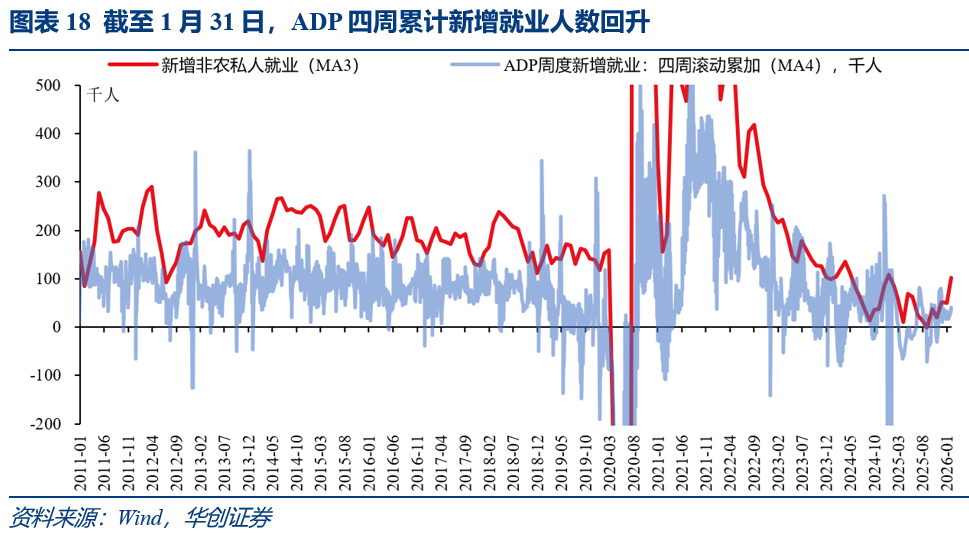 ADP周度新增就业回升。截至1月31日,ADP四周累计新增就业人数4.1万,前一周为3.1万。