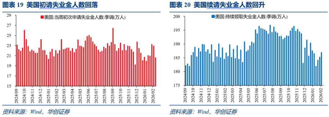 美国初请失业金人数回落,续请失业金人数回升。2月14日当周,美国初请失业金人数20.6万人,前一周为22.9万人,两周前为23.2万人。2月7日当周,美国续请失业金人数186.9万人,前一周为185.2万人,两周前为184.1万人。