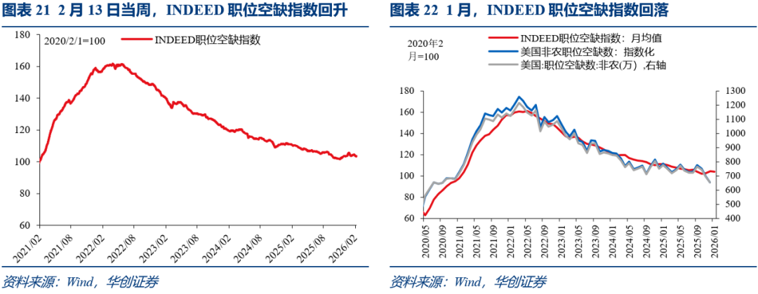 职位空缺数回升。2月13日当周,INDEED职位空缺指数回升,周度均值103.8,环比上周均值+0.3%。1月,INDEED职位空缺指数均值为104.0,低于12月均值104.2。