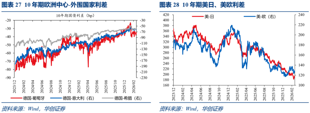 德葡利差收窄,德意利差走阔。2月20日,德国与葡萄牙、意大利10年期国债利差分别为-34.7bp、-61.1bp,一周前分别为-35.2bp、-60.4bp。