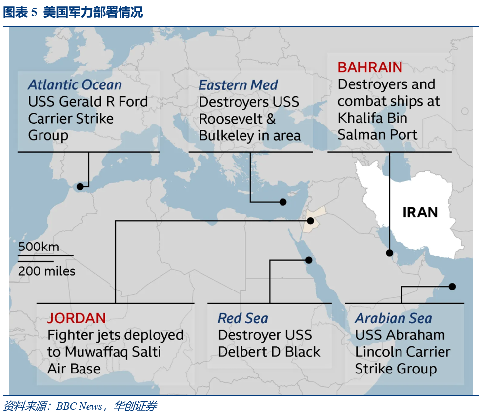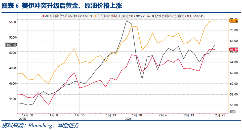 资本市场如何反应?如果美伊谈判破裂或者美军动手,霍尔木兹海峡可能短期受阻,同时市场正在定价美军的有限打击,因此WTI原油从2月17日约62.33美元升至2月20日66.39美元,创6个月以来新高,区间涨幅达到6.5%;而布伦特原油的则同期上涨了6.4%至71.76美元。