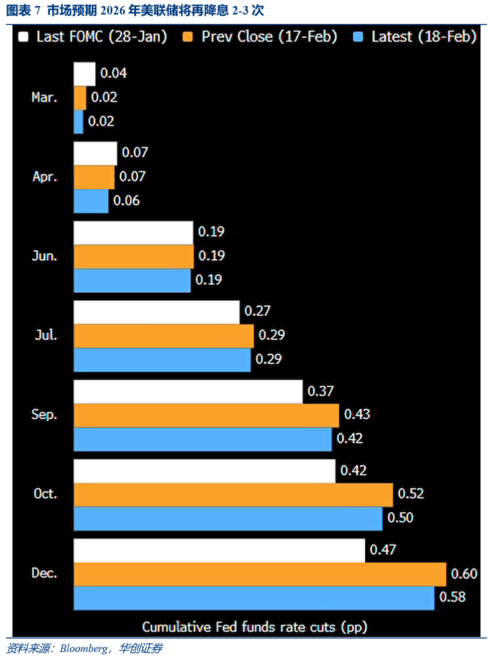 美联储降息的市场预期在FOMC会议纪要公布后几乎没有变化,投资者仍预计今年降息幅度约为60个基点,相比1月份FOMC会议后市场的预期略显宽松,不过这种预期主要集中于今年后期,这可能反映出市场认为凯文·沃什有可能成为美联储主席的预期。