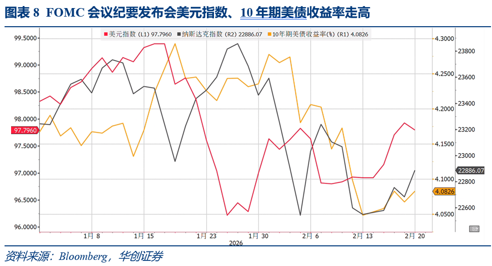 资本市场如何反应?由于FOMC会议的基调相比市场预期偏鹰,2月18日单日美元指数涨幅达到0.64%;与此同时,10年期美债收益率上行4BP。由于FOMC会议纪要中明确提到AI生产力加速将对通胀形成下行压力、支持2026G(核心股)DP上修至2.2%,直接利好科技股,叠加同日Meta Platforms宣布大规模AI数据中心扩建,纳斯达克上涨0.78%。