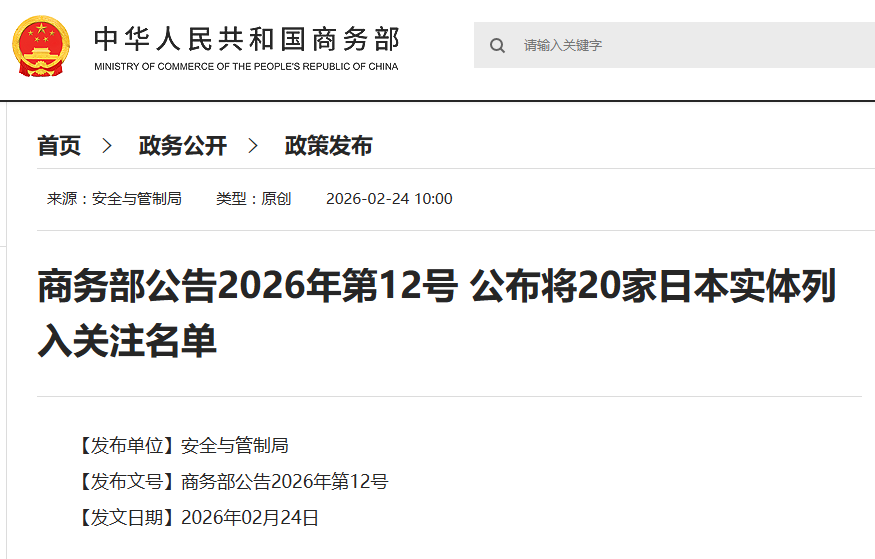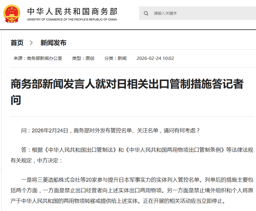 商务部新闻发言人就对日相关出口管制措施答记者问。问:2026年2月24日,商务部对外发布管控名单、关注名单,请问有何考虑?