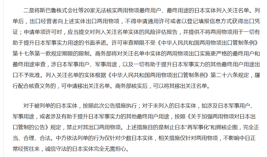 二是将斯巴鲁株式会社等20家无法核实两用物项最终用户、最终用途的日本实体列入关注名单。列单后,出口经营者向上述实体出口两用物项,不得申请通用许可或者以登记填报信息方式获得出口凭证;申请单项许可时,应当提交对列入关注名单实体的风险评估报告,并提供不将两用物项用于一切有助于提升日本军事实力用途的书面承诺。许可审查期限不受《中华人民共和国两用物项出口管制条例》第十七条第一款规定期限的限制。商务部将对关注名单中实体的两用物项出口实施更严格的最终用户和最终用途审查,涉日本军事用户、军事用途,以及一切有助于提升日本军事实力的其他最终用户用途出口不予批准。列入关注名单的实体根据《中华人民共和国两用物项出口管制条例》第二十六条规定,履行配合核查义务的,可申请移出关注名单。商务部核实后,可以将其移出关注名单。