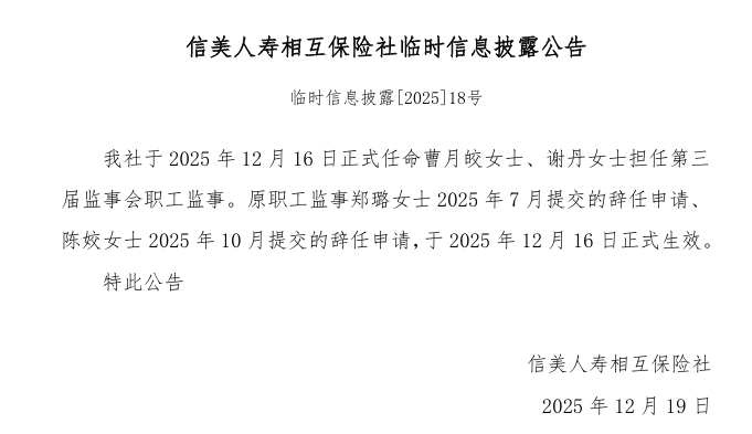 近日,据信美相互人寿2025年第四季度偿付能力报告,徐天舒卸任董事会秘书职务,由原职工监事郑璐出任。