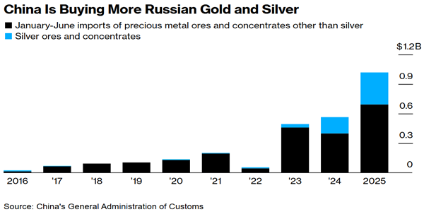 此前彭博社在7月援引贸易数据报道,俄罗斯对中国的贵金属出口在2025年上半年显著增长。