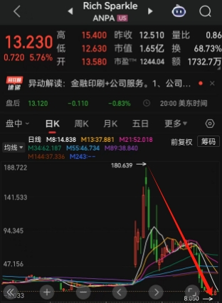 在无语哥以及小黑羊筹划资本运作的前后,2026年1月,Rich Sparkle(ANPA)再度暴涨,1月15日一度攀升至180美元上方,其间最大涨幅接近64倍。但是随后Rich Sparkle(ANPA)股价出现“脚踝斩”,在短短20多个交易日,从180美元一路跌至8.05美元。区间最大跌幅接近96%。