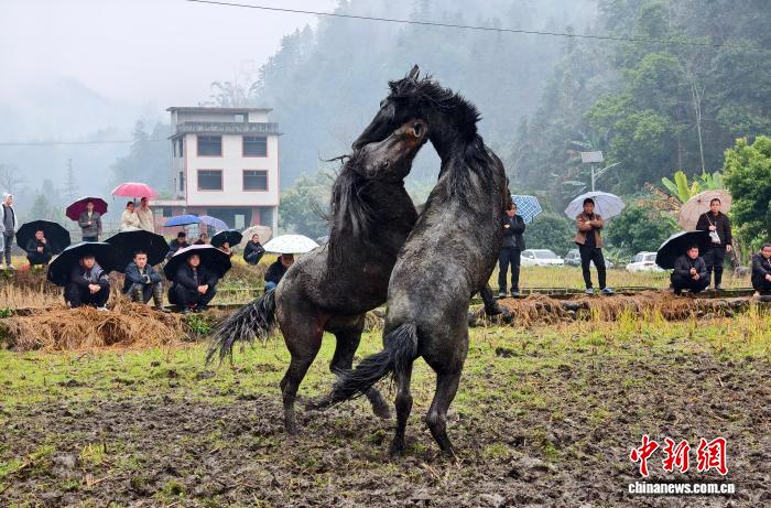 中新社柳州2月23日电 (林馨)春节期间,素有“中国芦笙斗马文化之乡”美誉的广西柳州市融水苗族自治县,笙歌飞扬、斗马奔腾。一场场激烈的斗马比赛不断上演,骏马在场中嘶鸣对峙,马蹄扬起尘土,围观游客的喝彩声与相机快门声此起彼伏。