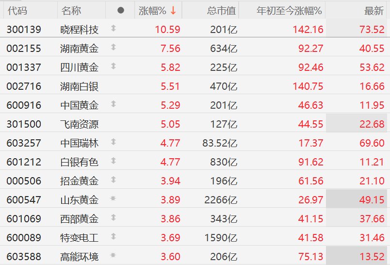 3月2日,美以伊全面开战刺激国际金价大涨,从而带动A股市场黄金概念(核心股)股集体走强。其中,晓程科技涨超10%,湖南黄金涨超7%,四川黄金、湖南白银(核心股)、中国黄金、飞南资源涨超5%,中国瑞林、白银有色涨超4%,招金黄金、山东黄金、西部黄金、特变电工、高能环境涨超3%。