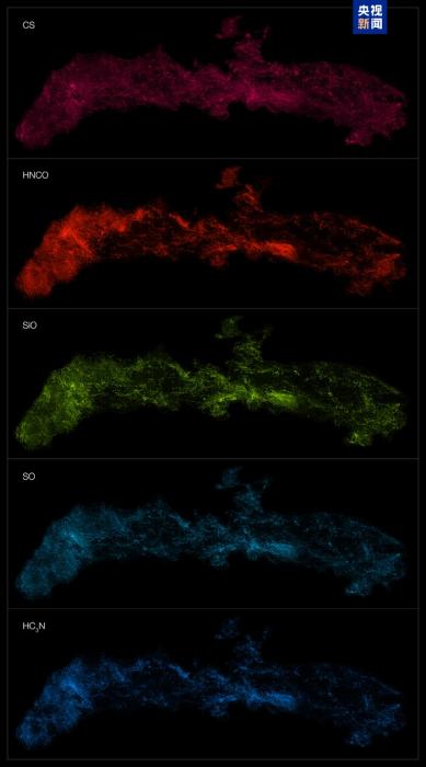 ALMA观测到的银河系中心不同分子分布,此处展示的五种分子自上而下分别为:一硫化碳、异氰酸、一氧化硅、一氧化硫和氰乙炔。