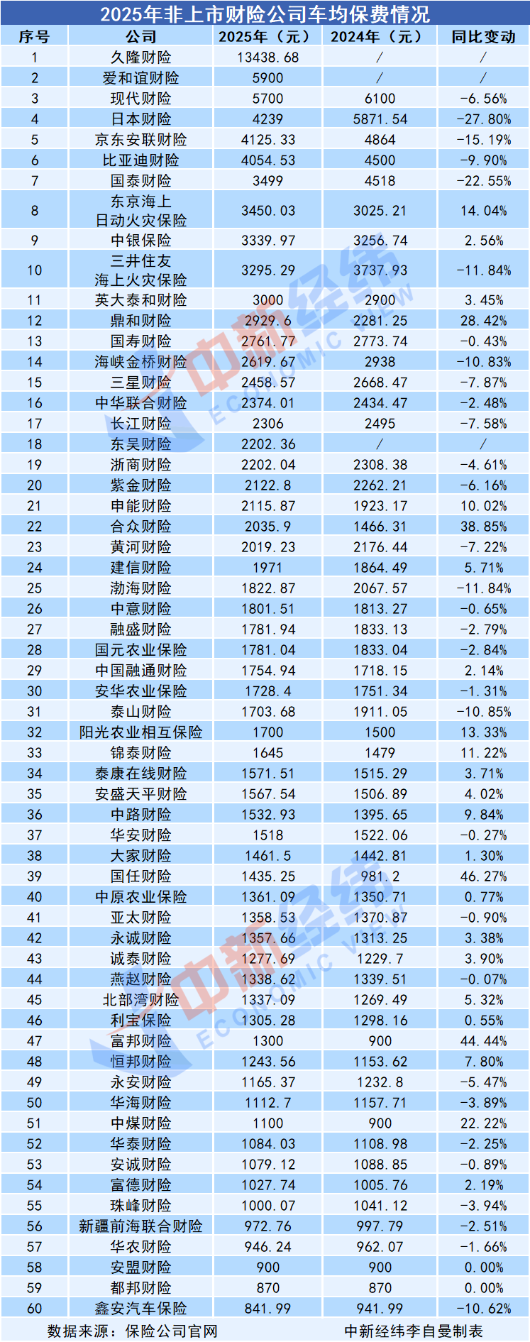 中新经纬统计发现,2025年不同财险公司的车险车均保费呈现出显著分化态势。