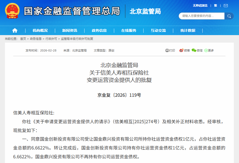 正文 信美人寿相互保险社获批变更运营资金提供人 三木 V管理员 /03-05 /0 评论 /8 阅读 0305 文章最后更新时间2026年03月05日,若文章内容或图片失效,请留言反馈! 近日,据北京金融监管局网站,北京金融监管局发布批复,同意国金创新投资有限公司受让国金鼎兴投资有限公司所持信美人寿相互保险社运营资金债权1亿元,占该社运营资金总额的6.6622%。转让完成后,国金创新投资有限公司持有该社运营资金债权1亿元,占运营资金总额的6.6622%,国金鼎兴投资有限公司不再持有该公司运营资金债权。 关键词阅读:
