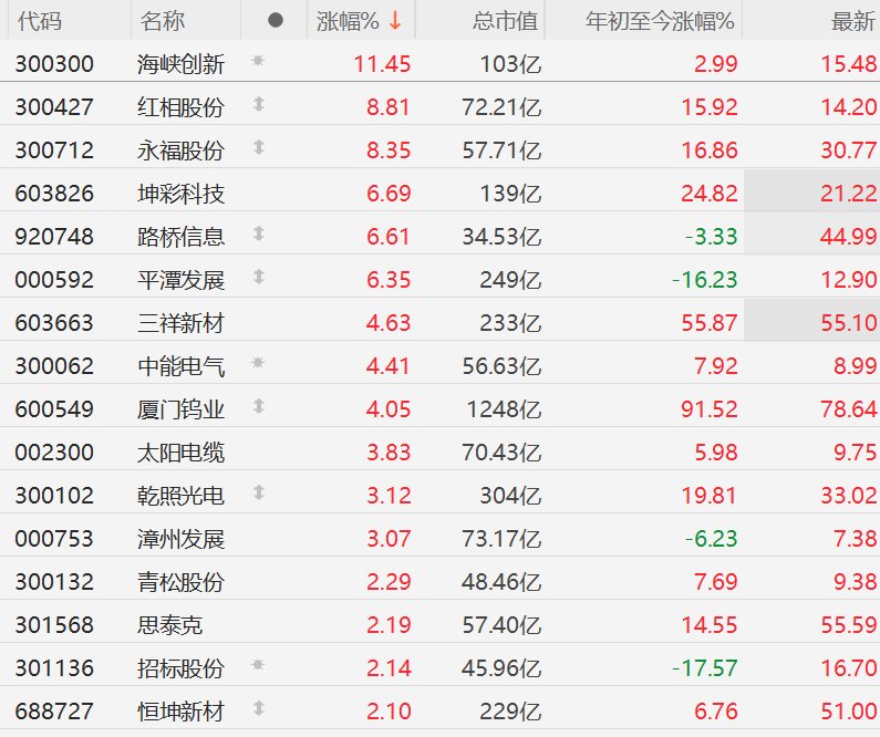 正文 福建概念股逆势上涨,海峡创新涨超11% 三木 V管理员 /03-05 /0 评论 /8 阅读 0305 文章最后更新时间2026年03月05日,若文章内容或图片失效,请留言反馈! 3月4日,A股市场部分福建概念股逆势上涨,海峡创新涨超11%,红相股份、永福股份涨超8%,坤彩科技、路桥信息、平潭发展涨超6%。消息面上,3日,中共福建省委、福建省人民政府发布《关于锚定农业农村现代化扎实推进乡村全面振兴的实施意见》,也就是2026年福建省委一号文件。 股票频道更多独家策划、专家专栏,免费查阅>>
