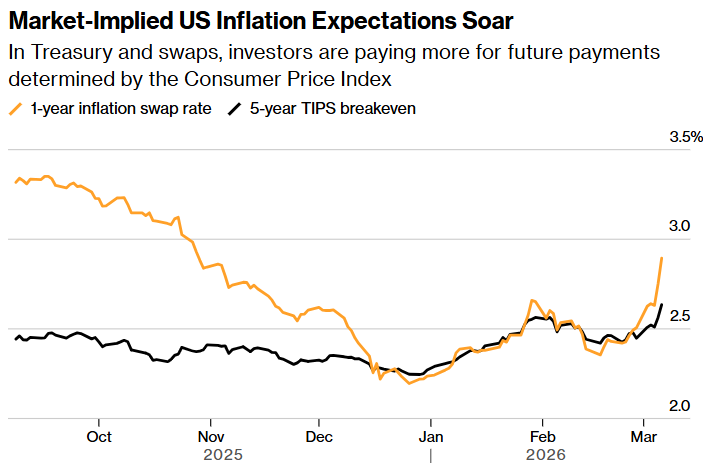 在美国国债和通胀互换市场,投资者可以获得与美国消费者价格指数挂钩的支付,但自美国和以色列周末袭击伊朗以及伊朗进行报复以来,随着石油价格飙升,这些支付的成本也随之飙升。