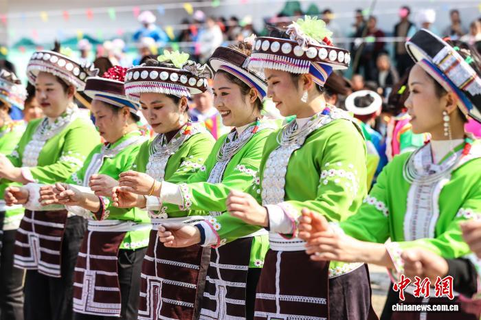 2月21日,贵州省龙里县湾滩河镇果里村举行一年一度的“跳洞”活动。图为苗族民众穿着节日盛装跳舞。 中新社记者 瞿宏伦 摄
