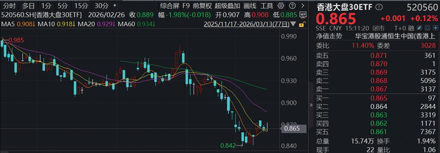 全市场首只*香港大盘30ETF(520560),自带“科技+红利”哑铃策略,重仓股既有阿里巴巴、腾讯控股等高弹性科技股,又囊括了建设银行、中国平安等稳健高股息。