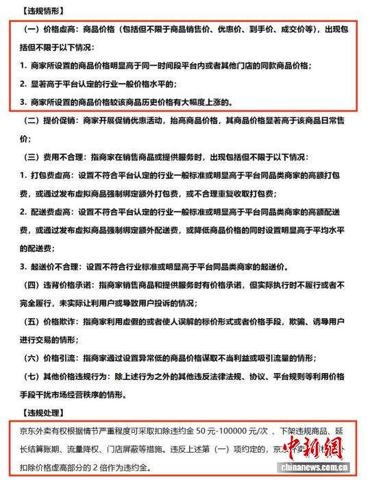上述商家提供的《京东外卖平台经营管理规范》显示,若商品价格明显高于同一时段平台内或其他门店的同款、行业一般水平或自身历史价格,商家可能面临“罚款”。