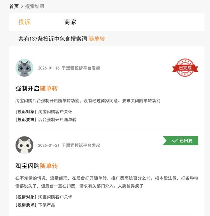 某消费投诉平台上关于外卖平台“随单转”的投诉。