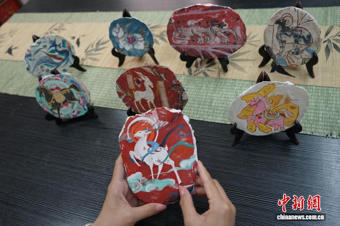 走进二人的工作室,泥板上“飞天”“藻井”“瑞兽”等经典纹样清晰可见,在矿物颜料与国画颜料的勾勒晕染下,焕发出独特韵味。
