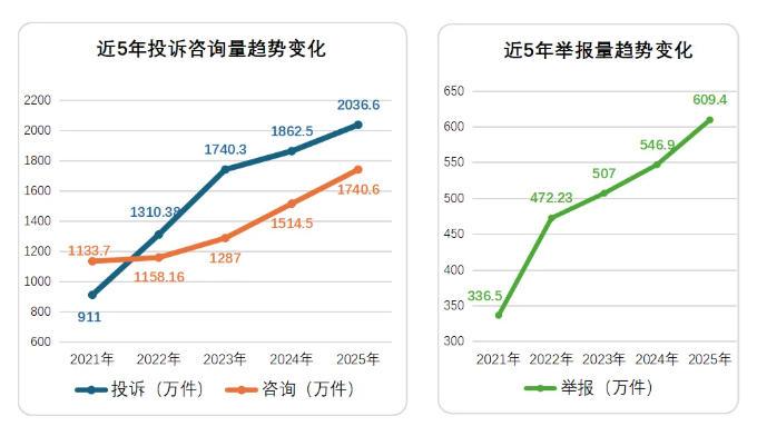 中新网3月15日电 据“市说新语”微信公众号消息,2025年,全国市场监管部门通过全国12315平台、电话等渠道共受理消费者投诉、举报和咨询4386.6万件(投诉举报2646万件,同比增长9.8%),其中投诉2036.6万件,同比增长9.3%;举报609.4万件,同比增长11.4%;咨询1740.6万件,为消费者挽回经济损失43.5亿元,有力保护了消费者合法权益。主要呈现十大特点: