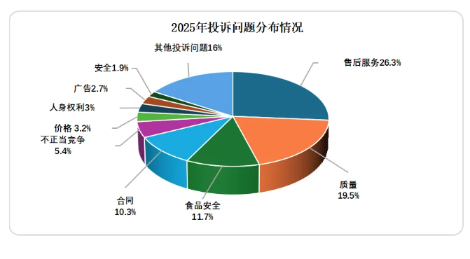 2025年,全国市场监管部门共受理投诉2036.6万件,同比增长9.3%,投诉总量首次突破2000万件,消费者维权意识持续增强。从投诉问题来看,售后服务(534.7万件)、质量问题(397.2万件)、食品安全问题(238.5万件)、合同问题(210.2万件)等问题相对突出,分别占投诉总量的26.3%、19.5%、11.7%、10.3%。售后服务投诉量已连续三年排在问题首位,凸显出部分商家对售后保障的重视程度不足,未能满足消费者的基础服务诉求。从增速看,合同问题同比增长40.3%,是投诉量增长最快的核心问题,消费者反映的问题主要集中在退款难、合同条款不透明、格式合同暗藏“霸王条款”、商家未按约定履约、宣传承诺与合同内容不一致等。