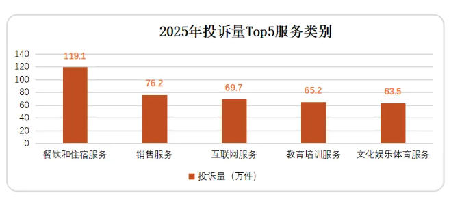 服务投诉中,餐饮住宿服务(119.1万件)、销售服务(76.2万件)、互联网服务(69.7万件)、教育培训服务(65.2万件)、文化娱乐体育服务(63.5万件)投诉量排名靠前,分别占比16.6%、10.6%、9.7%、9.1%、8.9%;投诉量超过10万件的服务中,租赁服务(19.8万件)、中介服务(12.2万件)、制作保养修理服务(21.6万件)、互联网服务、销售服务增速较快,分别同比增长31.6%、30.6%、24%、24%、19.2%。