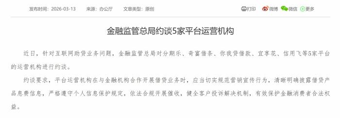 3月13日,国家金融监管总局发布消息称,约谈5家平台运营机构。