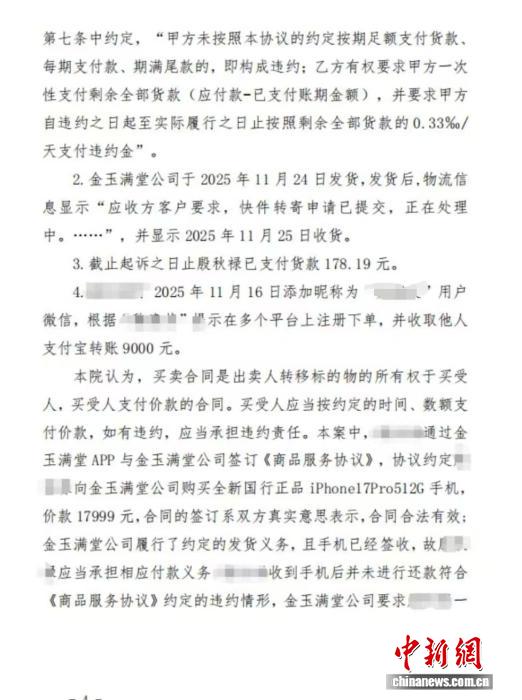 中介先是要求孙乐通过支付宝扫码领取“虚拟额度”,再在一家名为金玉满堂的商城,以16318元的价格下单购买一款顶配iPhone 16 Pro Max(512G)的手机。