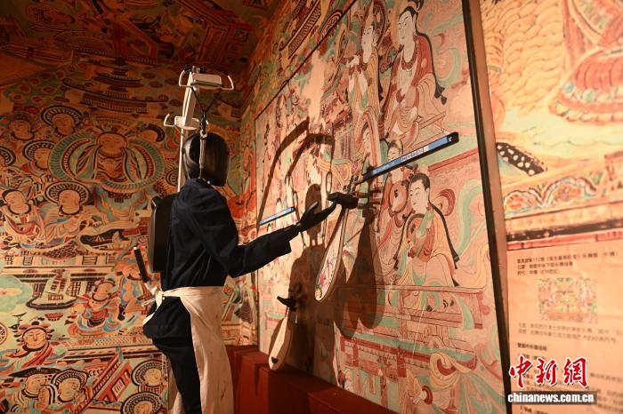 2月23日,位于甘肃兰州市城关区的移动机器人潮玩乐园内,市民操作机器人进行模拟壁画修复。中新社记者 李亚龙 摄