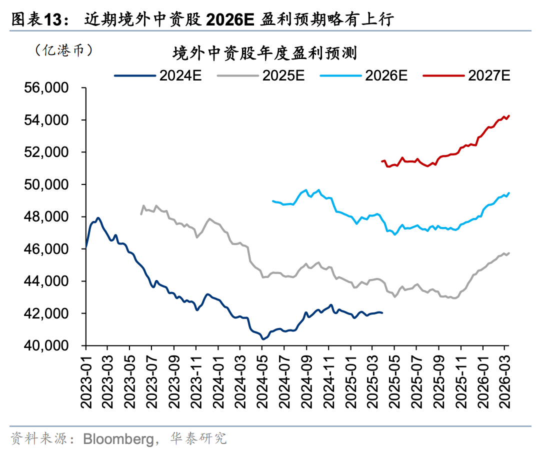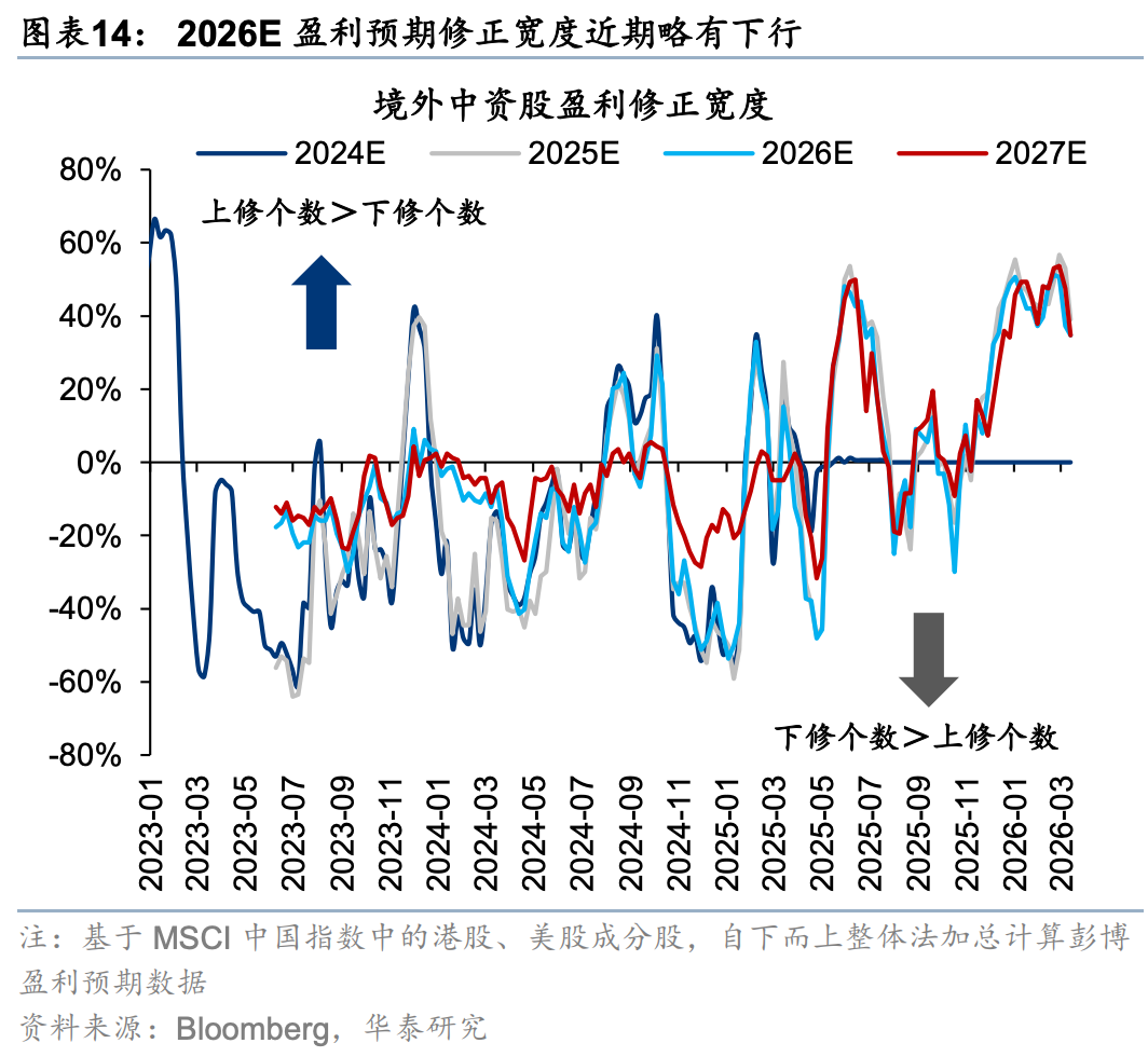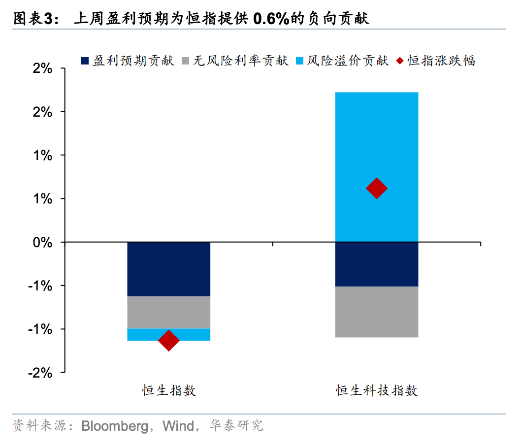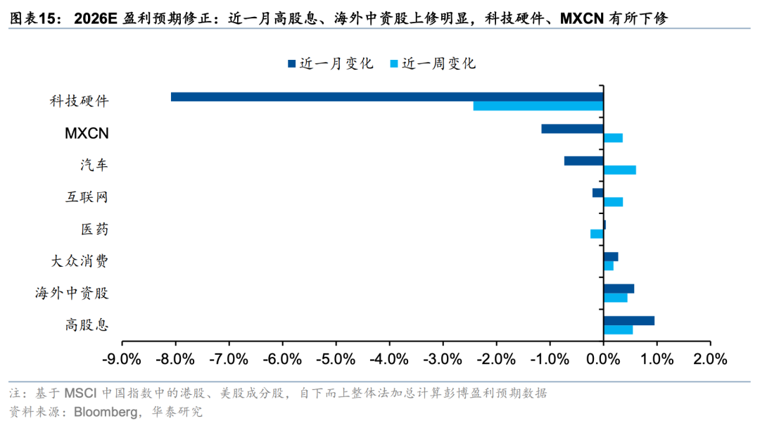 港股非金融彭博一致预期未来12个月盈利(以下简称盈利预期)近1周上修0.5%,近4周上修1.2%。ETF跟踪的重点板块上,近1周及近1月盈利预期均上修且幅度居前的包括汽车(0.9%/3.0%)、创新药(0.4%/3.9%)。互联网(0.2%/-0.6%)仍相对落后,近1周有边际企稳迹象,持续性待验。行业上,钢铁(核心股)、造纸(核心股)与包装近1周的盈利预期大幅改善,但波动较大。此外,电新(3.5%/6.4%)、交运(1.6%/2.0%)、可选零售(1.2%/1.4%)边际改善的幅度和持续性居前。上周涨幅居前的煤炭(核心股)和软件服务周度盈利预期分别调整0.4%/-0.1%,后者更直观地反映地缘风险下的交易行为变化。