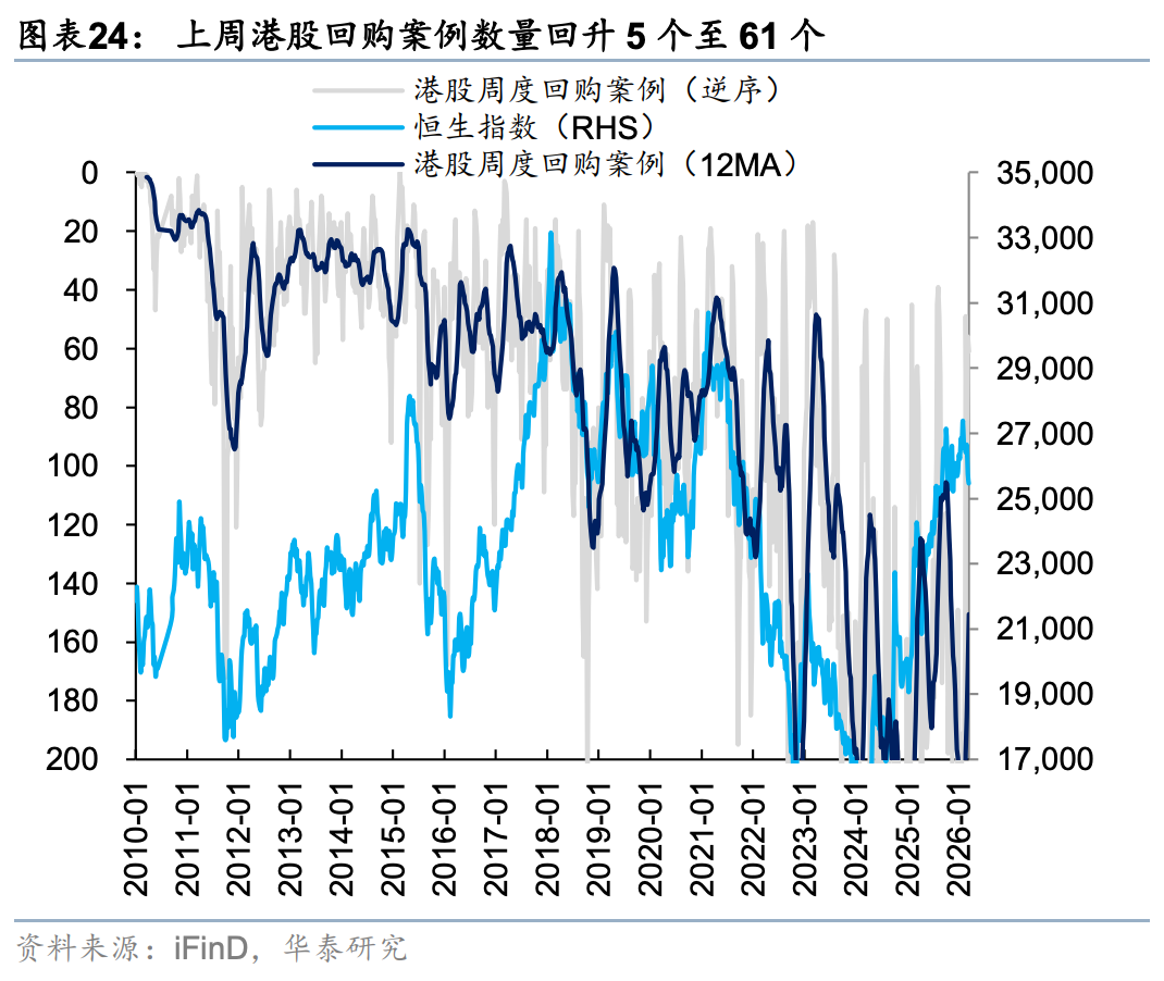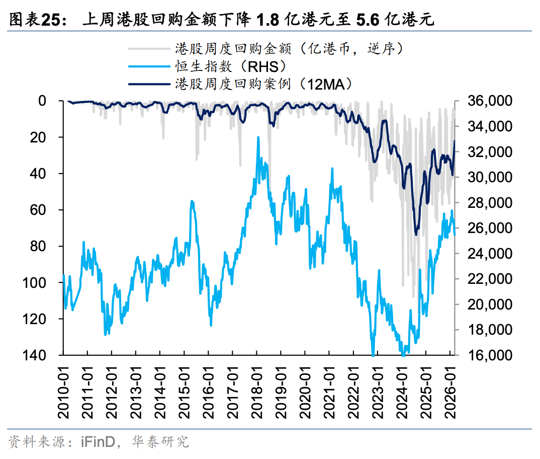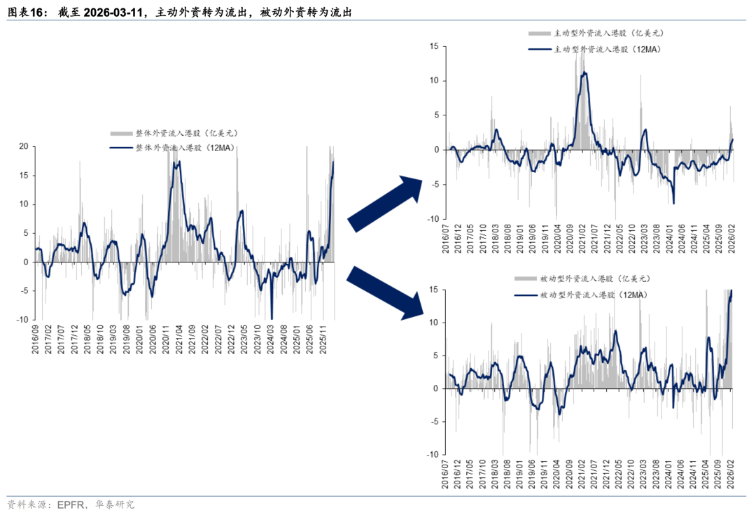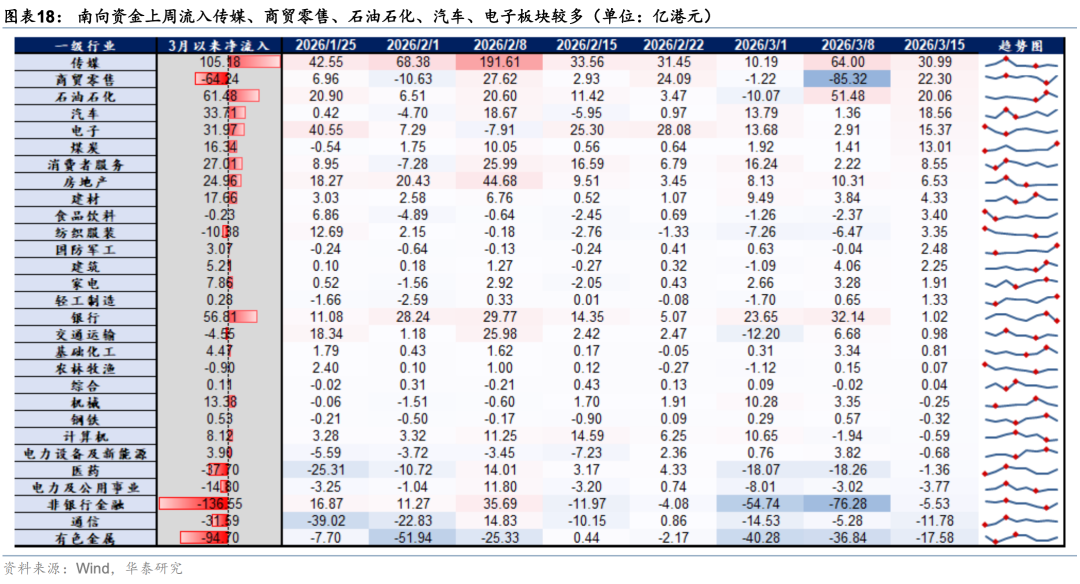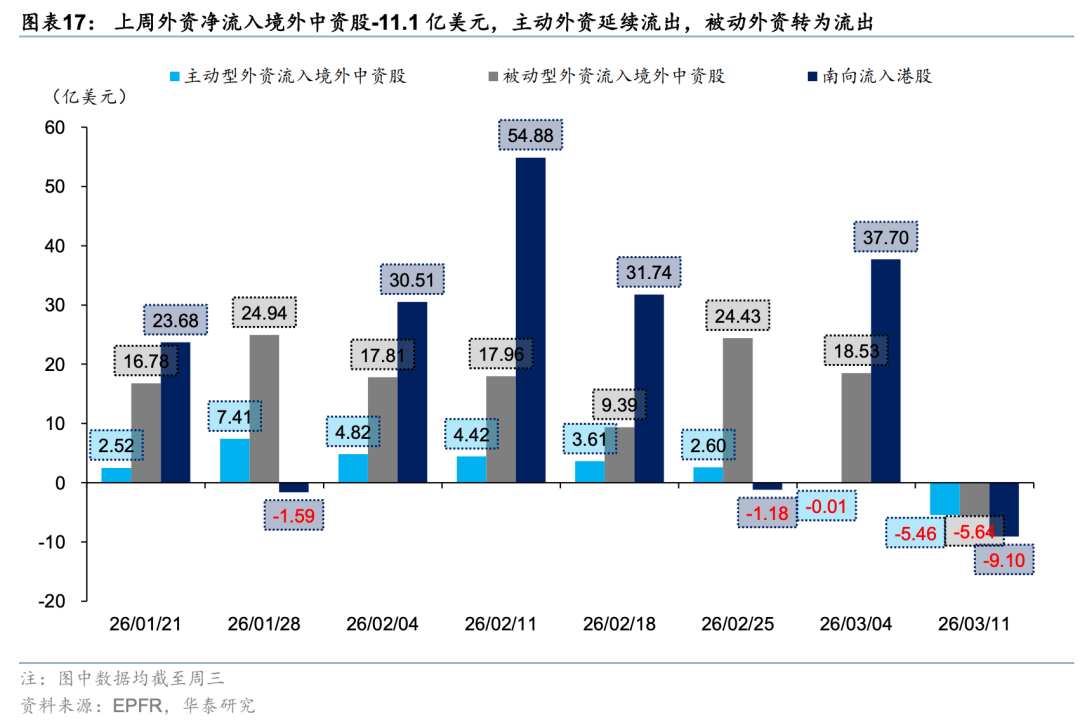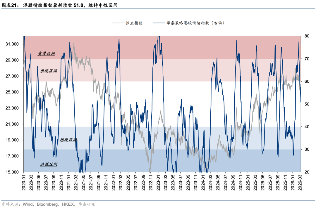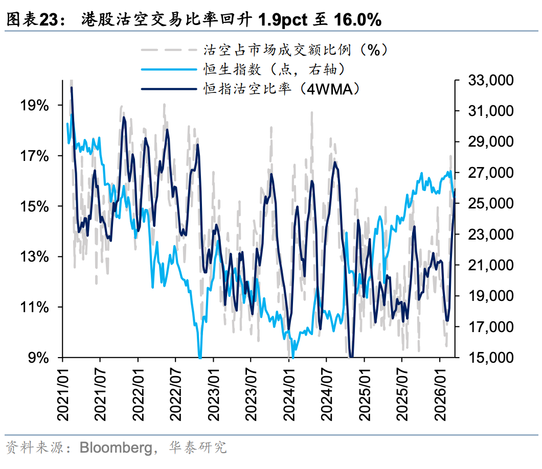 外资方面,截至周三EPFR口径下外资净流出港股10.6亿美元(前一周为净流入18.2亿美元),其中主动/被动外资流出4.6/6.1亿美元(前一周分别净流入0.4/17.8亿美元)。与此同时沽空比例明显下行0.12pct至2.32%,与2月中水平相当。我们在此前报告中《PPI转正和人民币升值两大交易主线更为明晰》(2026.3.1)中曾提出,今年部分外资以韩台等市场为目的地,增持亚洲或新兴市场同时对冲香港敞口。近期日韩市场大幅波动,杠杆资金有降温意愿,或同步促成港股沽空交易的平仓。南向方面,上周大幅买入港股524亿港币(前一周净流出81亿港币),分行业来看,截至周三传媒(核心股)、商贸零售、石油石化、汽车、电子板块净流入靠前。