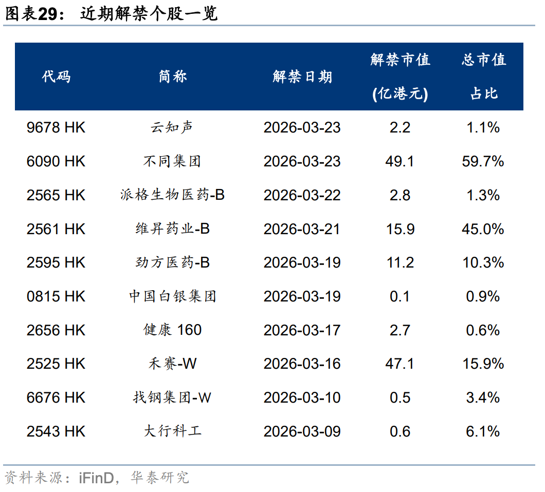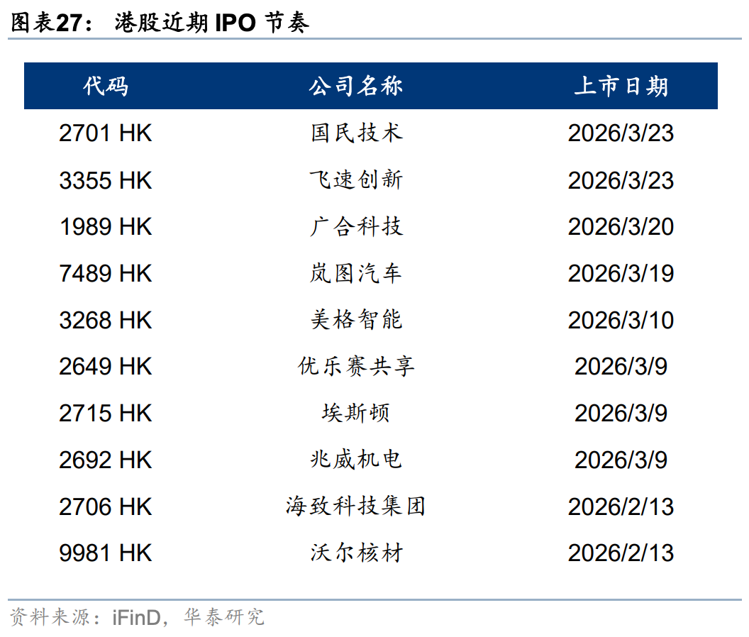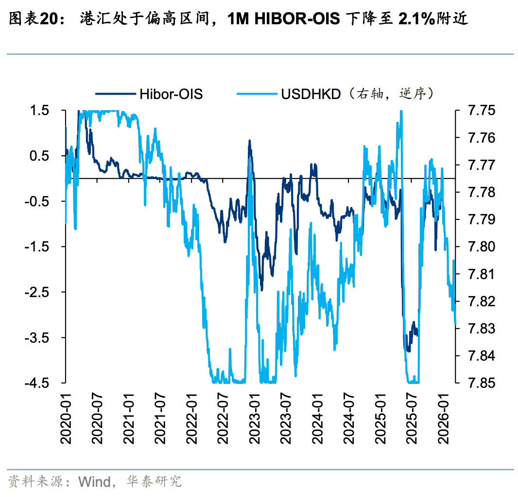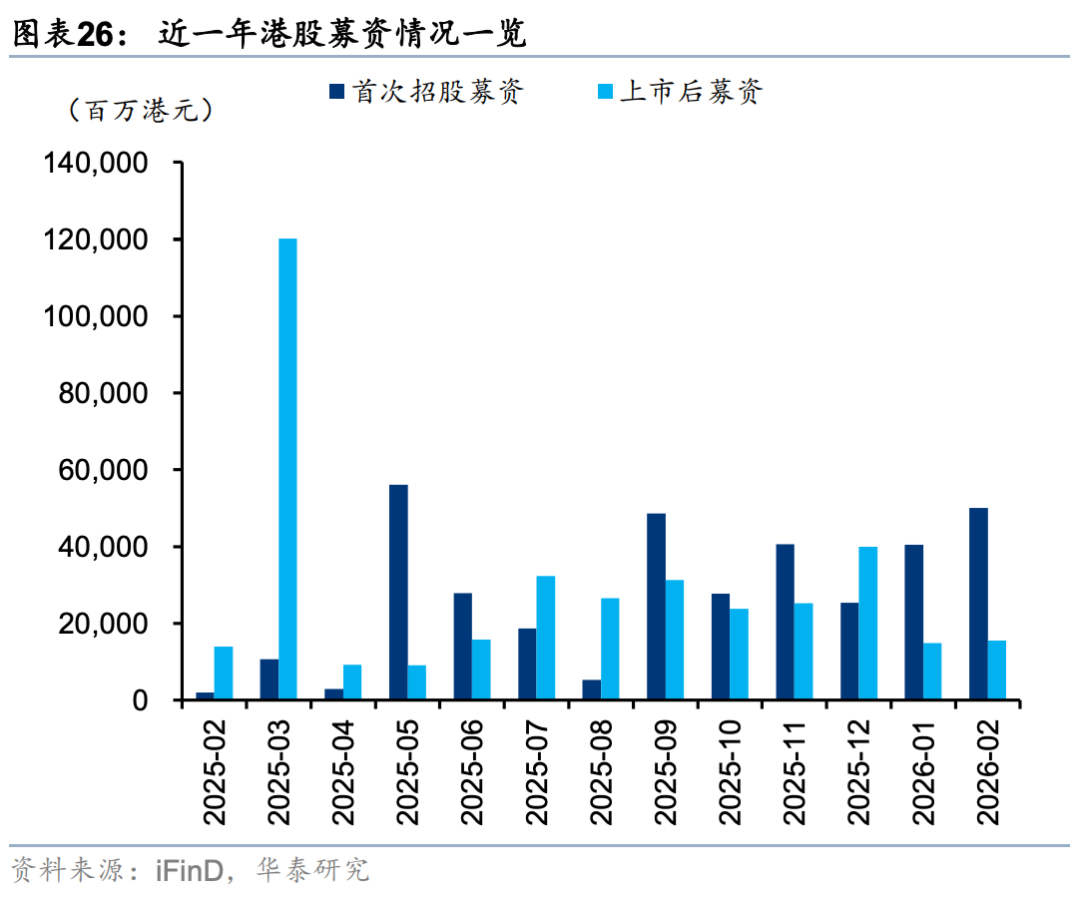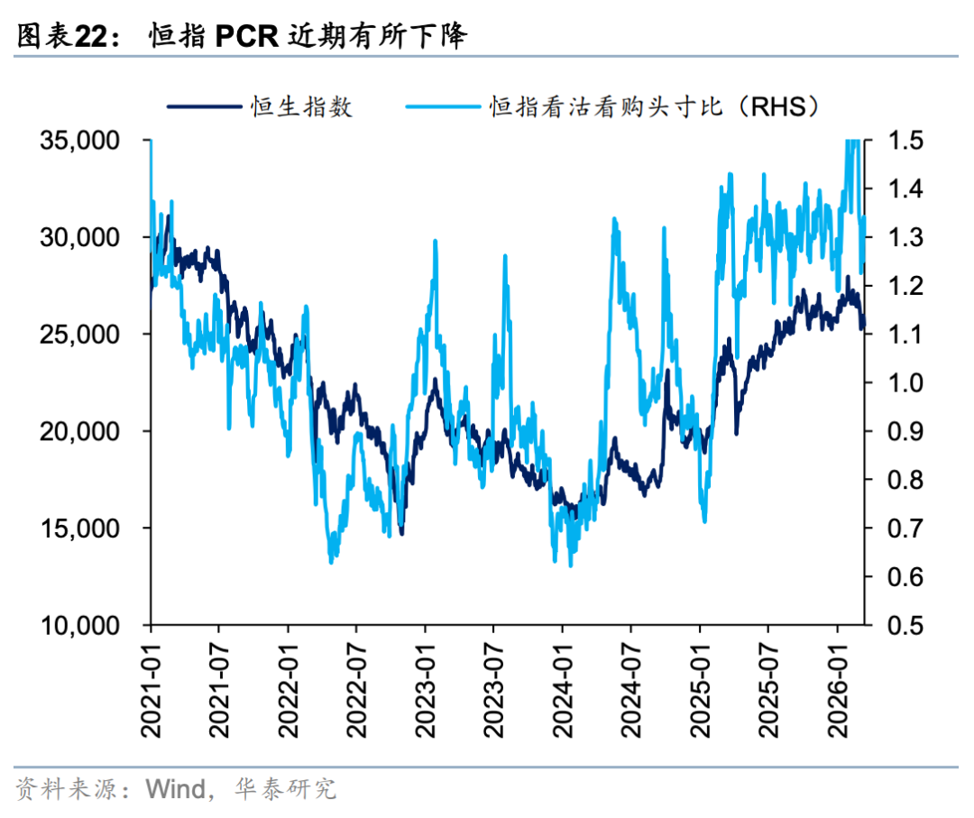 外资方面,截至周三EPFR口径下外资净流出港股10.6亿美元(前一周为净流入18.2亿美元),其中主动/被动外资流出4.6/6.1亿美元(前一周分别净流入0.4/17.8亿美元)。与此同时沽空比例明显下行0.12pct至2.32%,与2月中水平相当。我们在此前报告中《PPI转正和人民币升值两大交易主线更为明晰》(2026.3.1)中曾提出,今年部分外资以韩台等市场为目的地,增持亚洲或新兴市场同时对冲香港敞口。近期日韩市场大幅波动,杠杆资金有降温意愿,或同步促成港股沽空交易的平仓。南向方面,上周大幅买入港股524亿港币(前一周净流出81亿港币),分行业来看,截至周三传媒(核心股)、商贸零售、石油石化、汽车、电子板块净流入靠前。