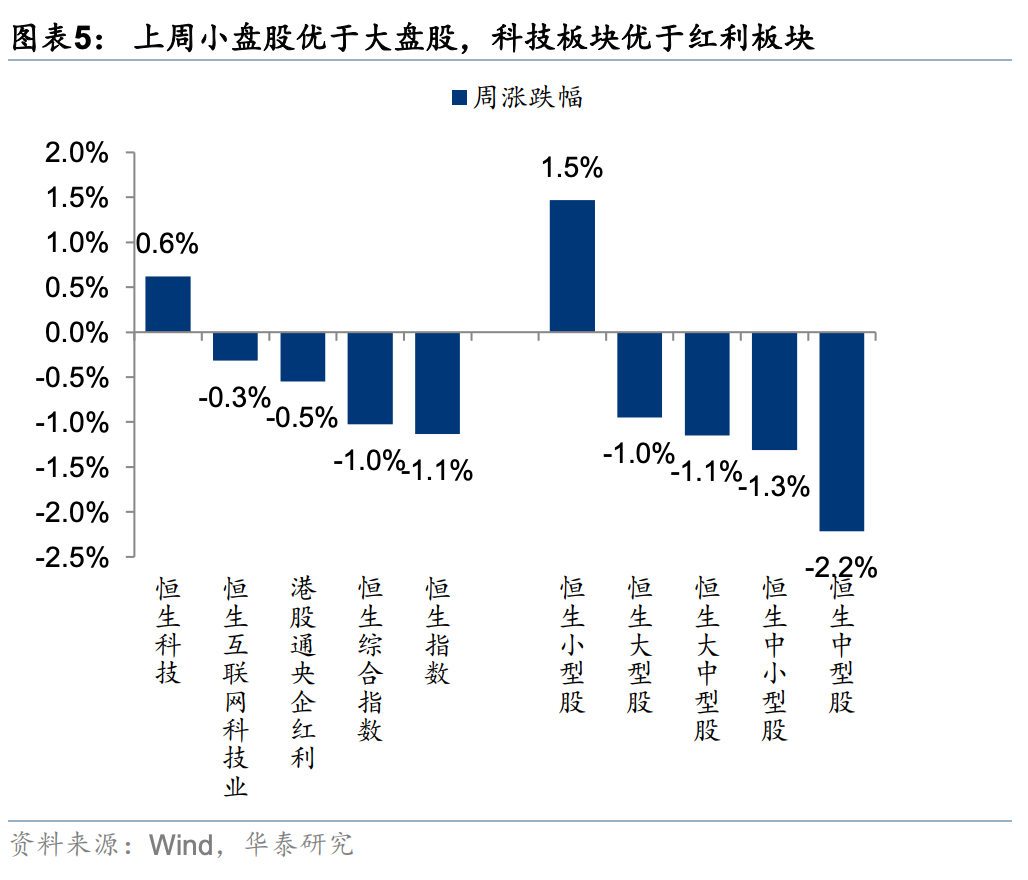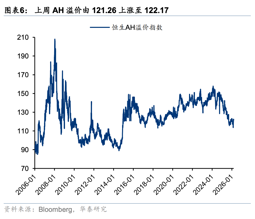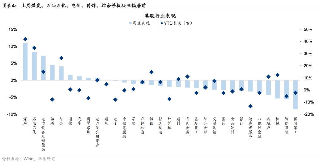 上周外部市场因地缘局势和油价的大幅变化依然维持高波动状态,但通常对地缘敏感的港股反而呈现相对韧性。主要原因一是港股具备大量的高股息和周期性品种,二是此前港股尤其是恒科持续承压过程中累积的空头头寸在高波动下部分平仓。往后看,我们认为指数底部渐进但持续性反弹仍需等待。外部因素当前美元偏强态势仍可能持续;内部因素财报季临近尾声,年初上修盈利预期的动能放缓,国内基本面尤其是地产数据仍需验证,目前情绪指数尚未指向买点。当前科技成长和滞涨交易主线并行,是在形势能见度较低背景下的分散之举,但两者本身自带矛盾,后续情形更加明朗后可能造成比较大幅的风格切换。考虑到目前投资者仓位和计价的不平衡,短期我们仍建议关注电力运营商、油气龙头、煤电联营龙头等;中期存储等半导体(核心股)硬件以及能出海的电力设备逢低吸筹;红利(尤其是香港本地股)仍是底仓重点。